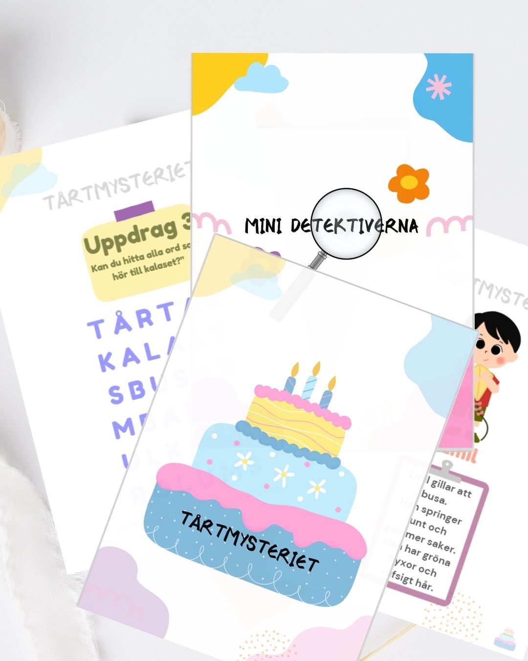 Tårtan är borta och festen är i fara. I detta mysterium får barnen leta ledtrådar, räkna, färglägga och lista ut vad som har hänt. Ett perfekt mysterium inför kalas eller bara en riktigt rolig dag.