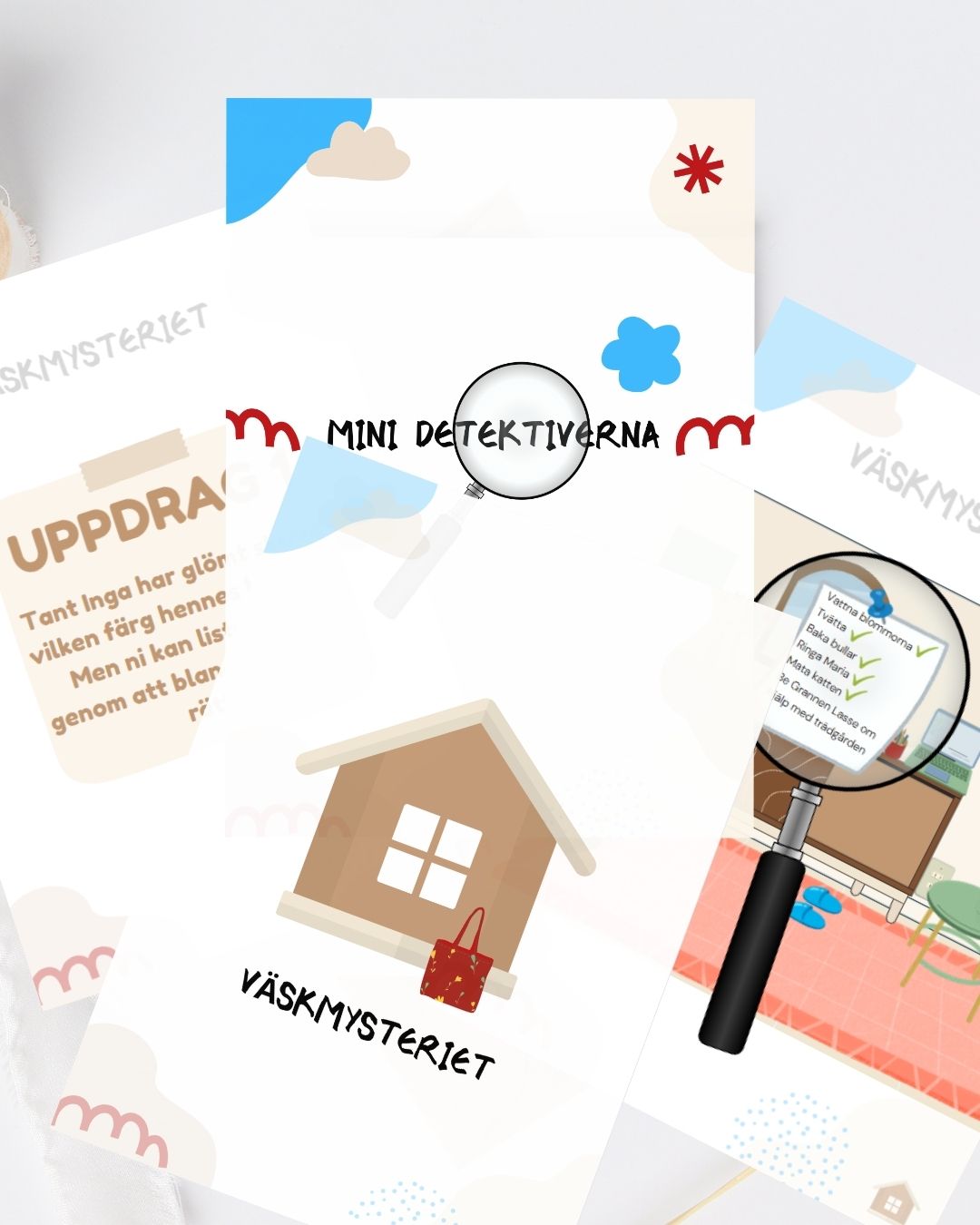 Någon har tappat bort sin väska. Barnen följer spår och löser uppgifter där logik, fantasi och lite tokighet leder framåt. Ett härligt mysterium som passar både yngre barn och större detektiver.
